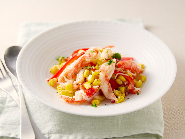 - 4ボウルに、1、コーン、パプリカ、熱々の3を全て加える。塩と粗びき黒こしょうで味を整え、器に盛りパセリを散らす。